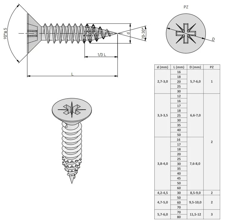 У шурупа конусообразно-плоская головка и резьба по всей длине. Шлиц PZ, зазубрины на 1/3 длины витков.