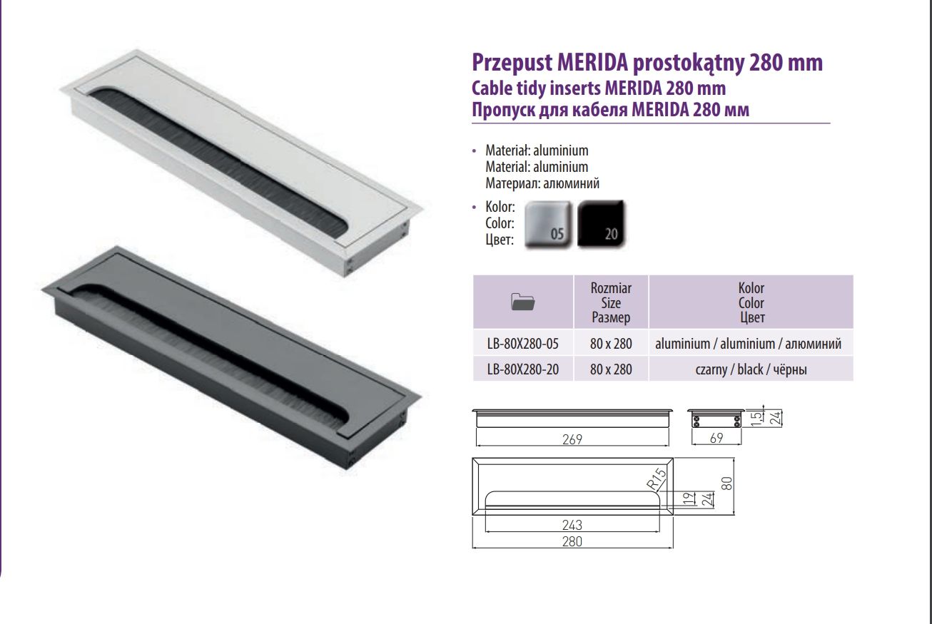 Пропуск для кабеля Merida 80х280, черный - дизайнерский вариант заглушки кабель-канала, имеющий прямоугольную форму. Заглушка устанавливается в технологическое отверстие офисного стола, через которое пропущены провода оргтехники, и придает рабочему месту эстетичный внешний вид.