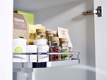 Торн Моушн - это вращающийся механизм, который помогает эффективно использовать сложнодоступные пространства на кухне — над встроенной бытовой техникой и в верхних отделениях высоких шкафов. Главное преимущество системы — независимое вращение каждой полки вокруг своей оси и регулировка по высоте. Так вы сможете грамотно задействовать каждый сантиметр кухни и быстро находить нужные вещи в шкафу.