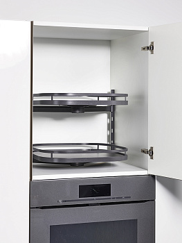 Торн Моушн - это вращающийся механизм, который помогает эффективно использовать сложнодоступные пространства на кухне — над встроенной бытовой техникой и в верхних отделениях высоких шкафов. Главное преимущество системы — независимое вращение каждой полки вокруг своей оси и регулировка по высоте. Так вы сможете грамотно задействовать каждый сантиметр кухни и быстро находить нужные вещи в шкафу.