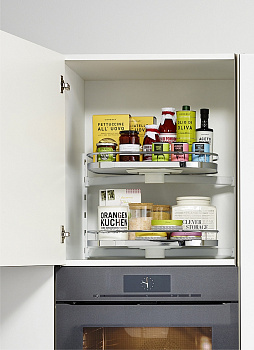 Торн Моушн - это вращающийся механизм, который помогает эффективно использовать сложнодоступные пространства на кухне — над встроенной бытовой техникой и в верхних отделениях высоких шкафов. Главное преимущество системы — независимое вращение каждой полки вокруг своей оси и регулировка по высоте. Так вы сможете грамотно задействовать каждый сантиметр кухни и быстро находить нужные вещи в шкафу.