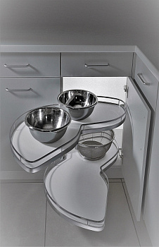 Механизм обладает набором функций и характеристик, которые позволяют эффективно использовать "мертвые зоны" нижних угловых тумб и правильно организовывать хранение кухонной утвари в одном месте.