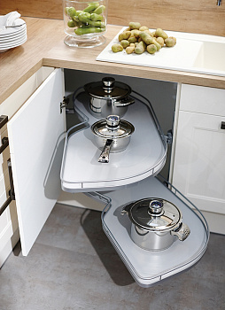 Механизм обладает набором функций и характеристик, которые позволяют эффективно использовать "мертвые зоны" нижних угловых тумб и правильно организовывать хранение кухонной утвари в одном месте.