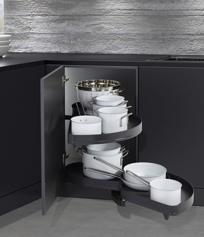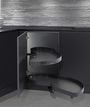 Механизм обладает набором функций и характеристик, которые позволяют эффективно использовать "мертвые зоны" нижних угловых тумб и правильно организовывать хранение кухонной утвари в одном месте.
