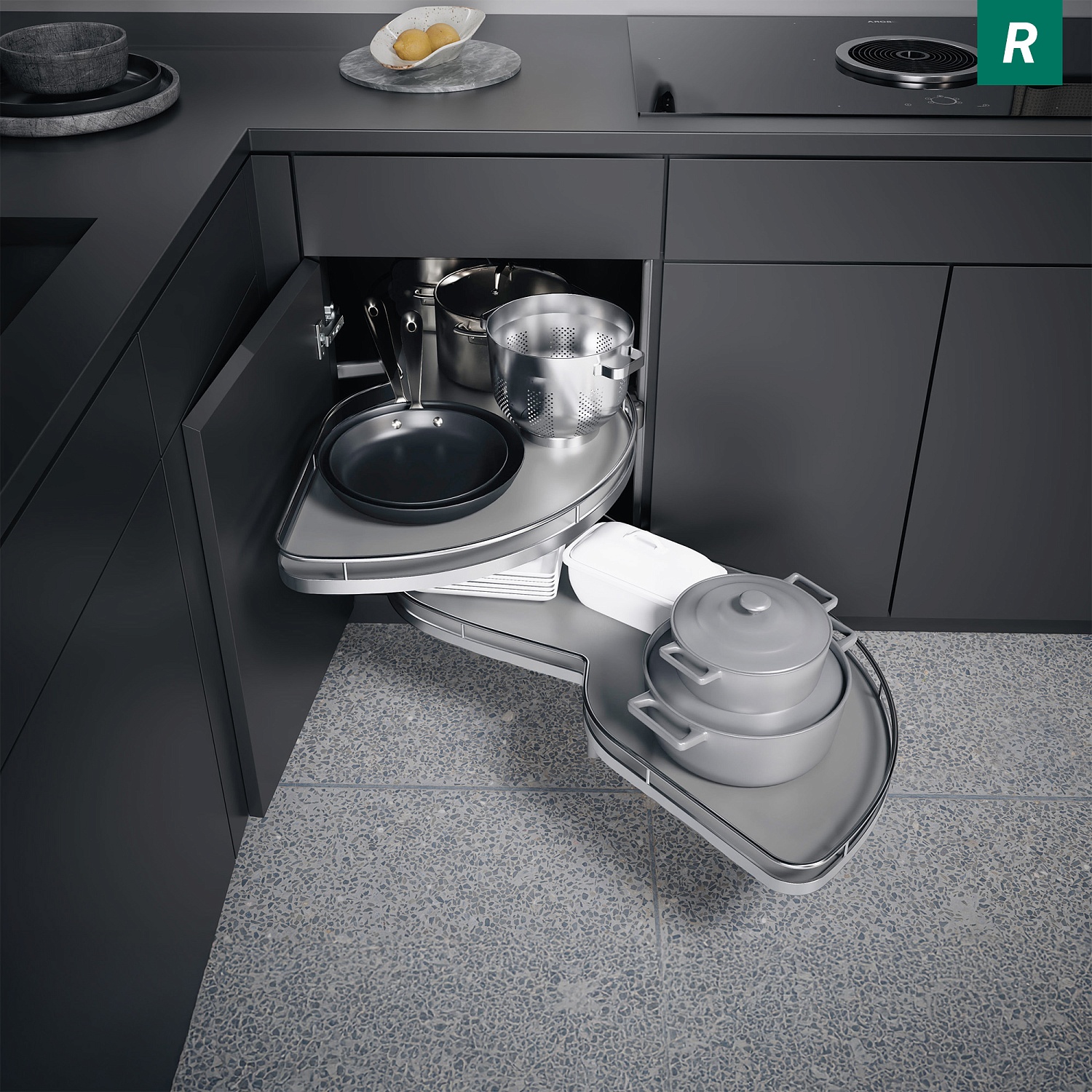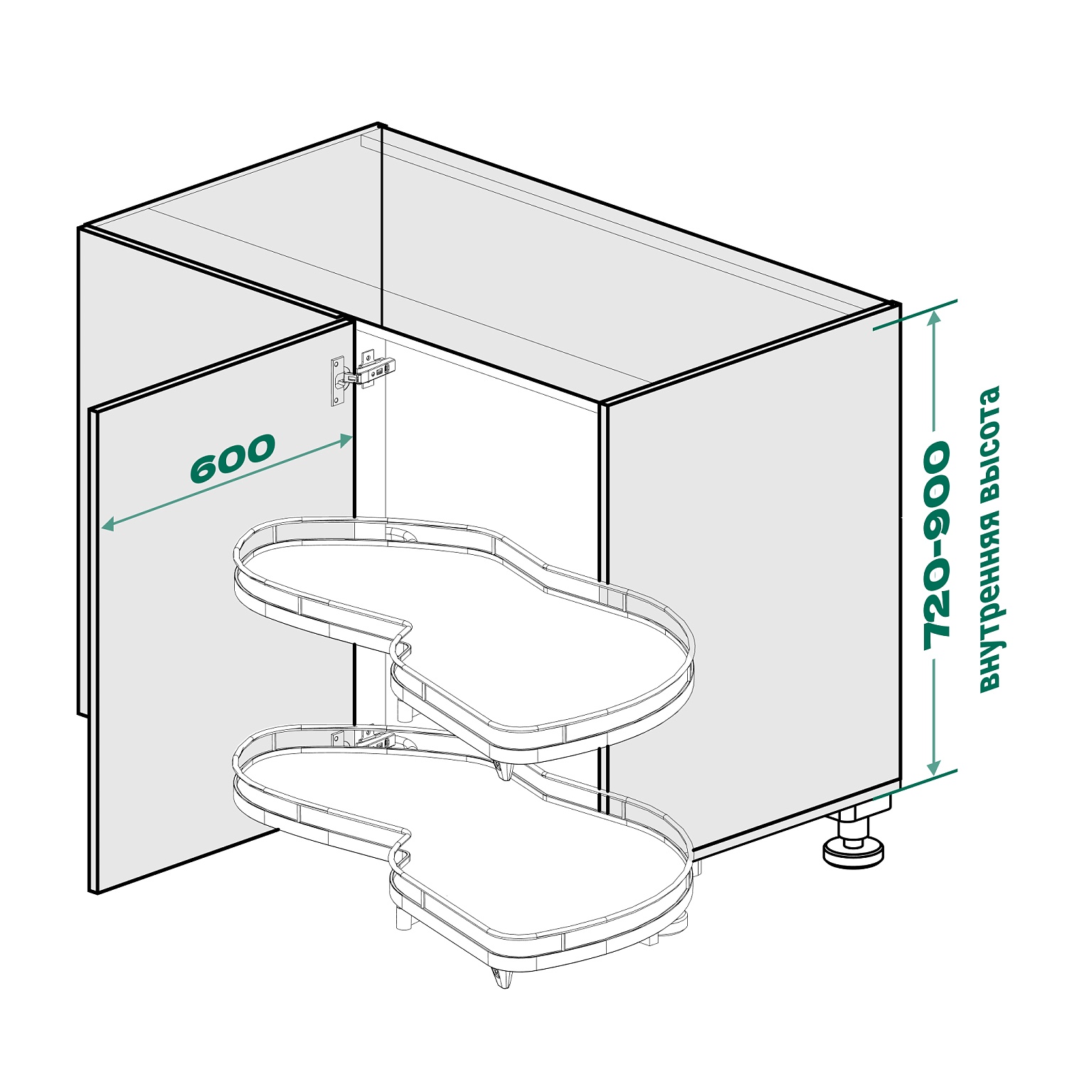 Механизм обладает набором функций и характеристик, которые позволяют эффективно использовать "мертвые зоны" нижних угловых тумб и правильно организовывать хранение кухонной утвари в одном месте.