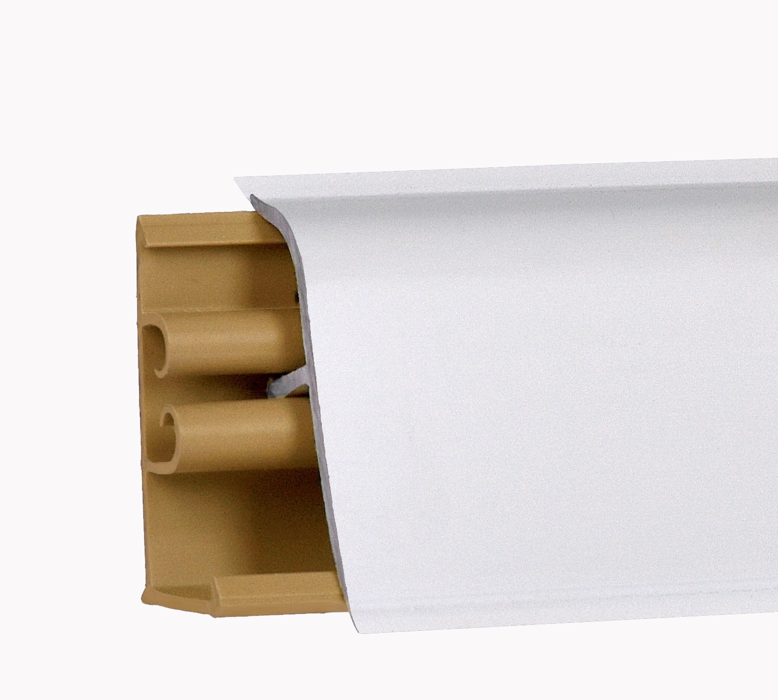 Ключевой особенностью конструкции являются уплотнительные края, которые теперь интегрированы на лицевую поверхность плинтуса и имеют 100% заливку по цвету - т.е. и резинка и плинтус идут одного декора.