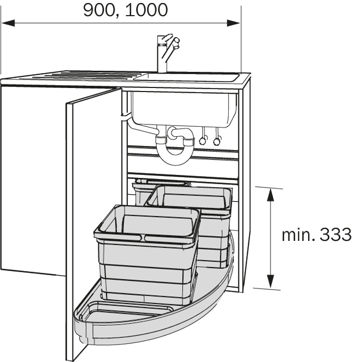 Ширина шкафа 900мм, ширина фасада 450мм., глубина шкафа 500мм. Высота системы с ведрами составляет всего 333мм—подходит для установки под мойкой. Ведра можно дополнить функциональными крышками-лотками для кухонных мелочей и крышкой совок+щетка. Используйте также полку арт. 5280.91.90610 для лучшей организации пространства.