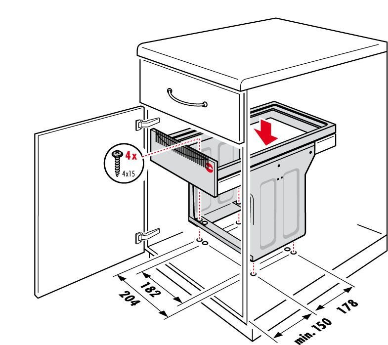 Комплектация: Рама и шариковые направляющие полного выдвижения с легким ходом (металл), стационарная крышка и два ведра по 15л (темно-серый пластик), комплект для уборки: совок и щетка (красный пластик), шаблон для монтажа, крепеж.