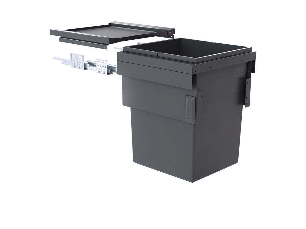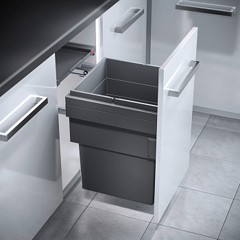 Cargo Synchro - современное решение для ценителей комфорта на кухне. Направляющие полного выдвижения с функцией Soft-Control плавно и мягко скользят, они защищены панелями от попадания мусора, что облегчает уход и обеспечивает долгий срок эксплуатации. Ведра большого объема особенно удобны в больших семьях, а также в загородном доме, где мусор не вывозят ежедневно. Верхняя выдвижная полка крепится на боковины шкафа, на ней удобно хранить бытовые мелочи и средства по уходу. Оснащение шкафа системой бесконтактного открывания Libero или Automatic Door добавит комфорта.