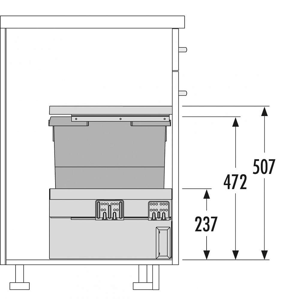 Cargo Synchro - современное решение для ценителей комфорта на кухне. Направляющие полного выдвижения с функцией Soft-Control плавно и мягко скользят, они защищены панелями от попадания мусора, что облегчает уход и обеспечивает долгий срок эксплуатации. Контейнер большого объема актуален в большой семье, а также в загородном доме, где мусор не вывозят ежедневно. Верхняя выдвижная полка крепится на боковины шкафа, на ней удобно хранить бытовые мелочи и средства по уходу. Оснащение шкафа системой бесконтактного открывания Libero или Automatic Door добавит комфорта. Система не подходит по высоте для установки в шкаф с мойкой.