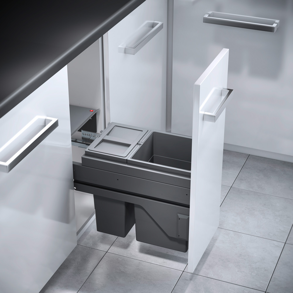Система сортировки мусора с креплением выдвижного фасада - современное решение для ценителей комфорта на кухне. Вам не нужно изготавливать ящик, направляющие крепятся на стенки шкафа, а фасад - непосредственно к системе. Направляющие полного выдвижения с функцией Soft-Control обеспечивают мягкий ход и комфортный доступ к ведрам. От попадания мусора направляющие защищены панелями. Стационарная крышка крепится на боковины шкафа, на ней удобно хранить хозяйственные перчатки или мусорные пакеты.