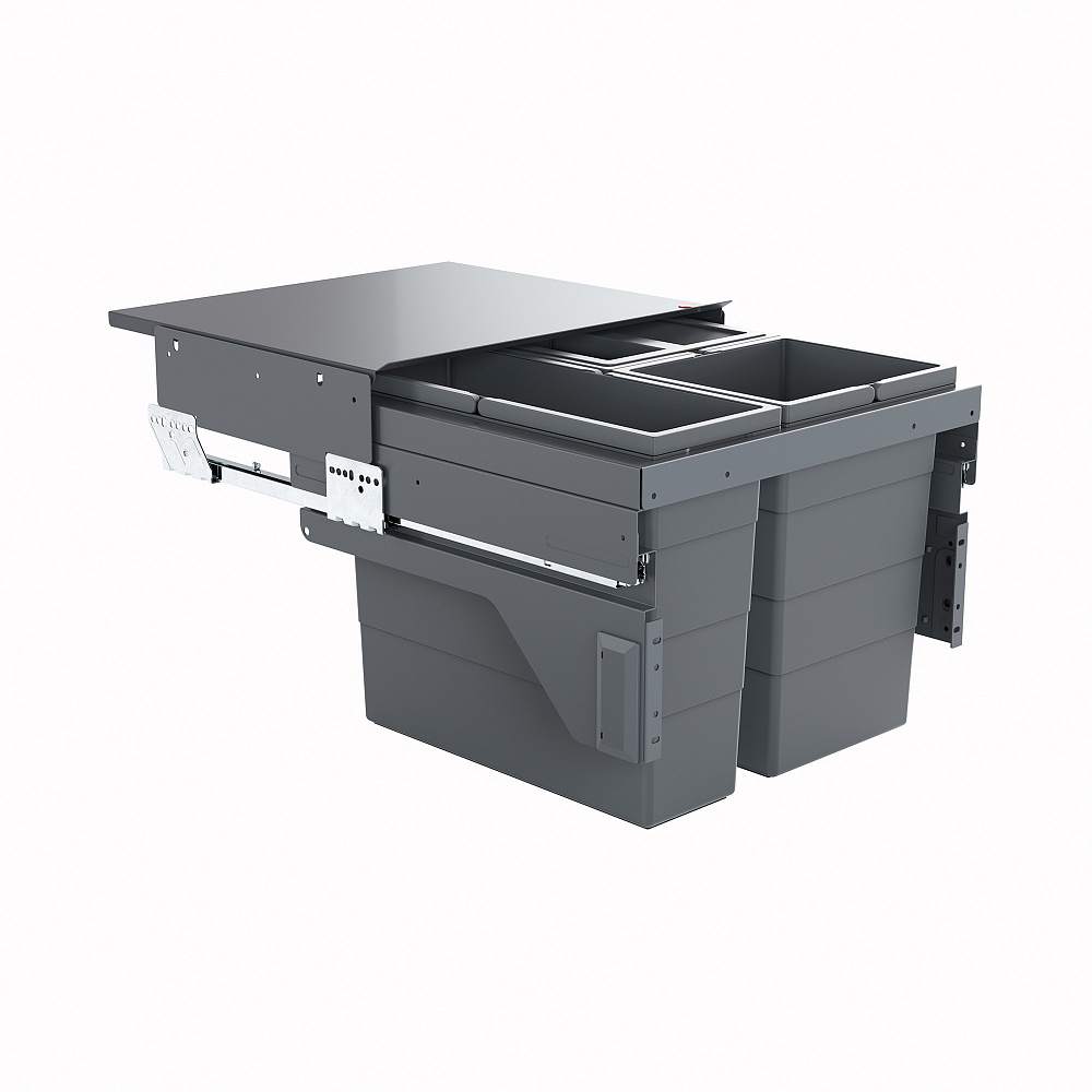 Система сортировки мусора с креплением выдвижного фасада - современное решение для ценителей комфорта на кухне. Вам не нужно изготавливать ящик, направляющие крепятся на стенки шкафа, а фасад - непосредственно к системе. Направляющие полного выдвижения с функцией Soft-Control обеспечивают мягкий ход и комфортный доступ к контейнерам. От попадания мусора направляющие защищены панелями. Стационарная крышка крепится на боковины шкафа, на ней удобно хозяйственные перчатки или мусорные пакеты. Система подходит по высоте для установки в шкаф с мойкой (за исключением моек, установленных под столешницу - может не пройти по высоте). Для облегчения обвязки мойки рекомендуем компактный сифон 3693-00.
