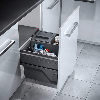Система сортировки мусора с креплением выдвижного фасада - современное решение для ценителей комфорта на кухне. Вам не нужно изготавливать ящик, направляющие крепятся на стенки шкафа, а фасад - непосредственно к системе. Направляющие полного выдвижения с функцией Soft-Control обеспечивают мягкий ход и комфортный доступ к контейнерам. От попадания мусора направляющие защищены панелями. Стационарная крышка крепится на боковины шкафа, на ней удобно хранить хозяйственные перчатки или мусорные пакеты. Система высотой всего 370мм подходит для установки в шкаф с мойкой. Для облегчения обвязки мойки рекомендуем компактный сифон.