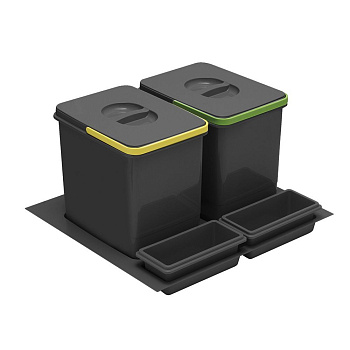 Комплект вёдер МУЛЬТИНО 600 2х15 L+2 ёмкости, антрацит - набор вместительных емкостей для бытовых отходов, предназначенный для установки в ящик 600 мм выдвижной системы Modern Box. Ведра изготовлены из экологичного пластика и позволяют сортировать мусор в соответствии с современной практикой утилизации отходов.