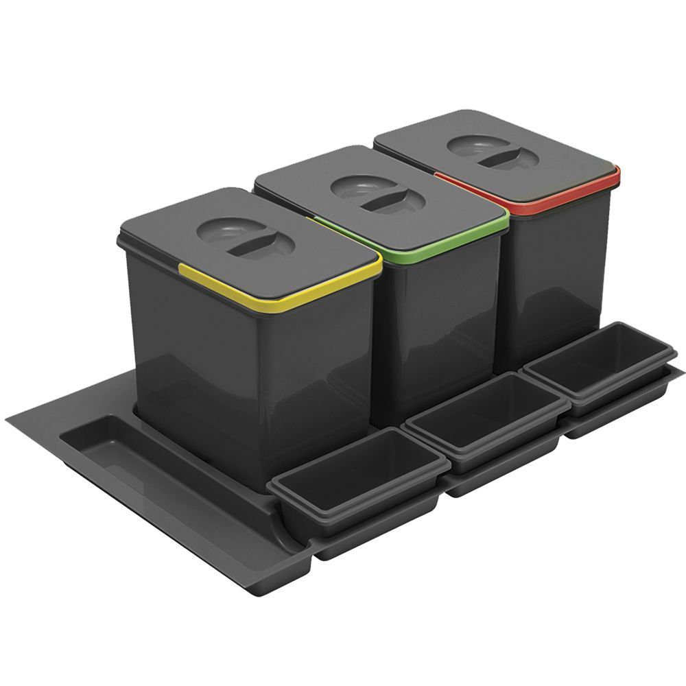 Комплект вёдер МУЛЬТИНО 800 3х15 L+3 ёмкости, антрацит - набор вместительных емкостей для бытовых отходов, предназначенный для установки в ящик 800 мм выдвижной системы Modern Box. Ведра изготовлены из экологичного пластика и позволяют сортировать мусор в соответствии с современной практикой утилизации отходов.