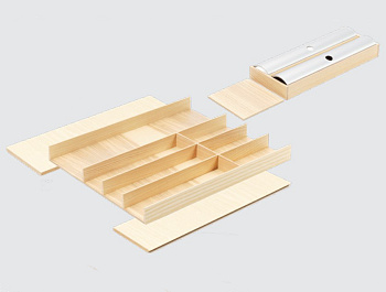 Организацию пространства легко сконфигурировать из отдельных элементов для любого выдвижного ящика (как с прямыми, так и со скошенными боковинами). Вы можете организовать отдельные места для хранения ножей, специй, рулонов фольги и пекарской бумаги, мерных емкостей и прочих вещей.