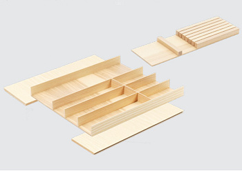 Организацию пространства легко сконфигурировать из отдельных элементов для любого выдвижного ящика (как с прямыми, так и со скошенными боковинами). Вы можете организовать отдельные места для хранения ножей, специй, рулонов фольги и пекарской бумаги, мерных емкостей и прочих вещей.