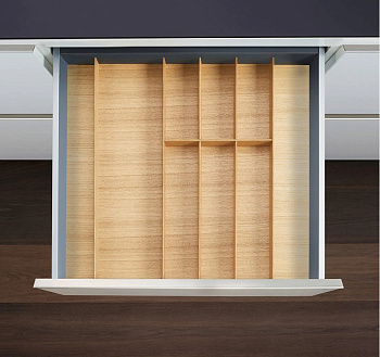 Организацию пространства легко сконфигурировать из отдельных элементов для любого выдвижного ящика (как с прямыми, так и со скошенными боковинами). Вы можете организовать отдельные места для хранения ножей, специй, рулонов фольги и пекарской бумаги, мерных емкостей и прочих вещей.