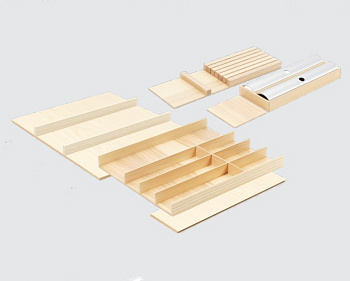 Организацию пространства легко сконфигурировать из отдельных элементов для любого выдвижного ящика (как с прямыми, так и со скошенными боковинами). Вы можете организовать отдельные места для хранения ножей, специй, рулонов фольги и пекарской бумаги, мерных емкостей и прочих вещей.