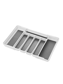 Этот органайзер с регулируемой шириной (30–52 см) идеально впишется в кухонные ящики 400–600 мм. Вмещает вилки, ложки, ножи и даже крупные предметы в 5–7 отделениях. Прочный пищевой пластик без бисфенола-А безопасен для посуды, не боится влаги и легко моется.