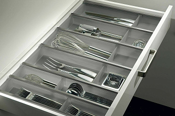 Элегантные лотки для современной кухни: алюминиевый профиль и высококачественный тонированный пластик. Поперечные перегородки можно передвигать и устанавливать в размер хранимых предметов.