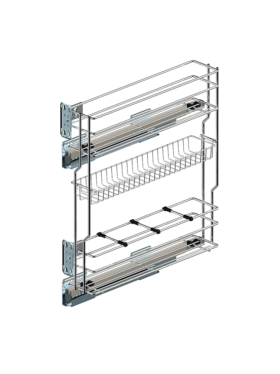 Универсальная выдвижная корзина предназначена для шкафов шириной 150 мм, подходит для использования с различными типами направляющих: REJS PUSH с отталкивателем или REJS FULL с амортизатором (приобретаются отдельно).