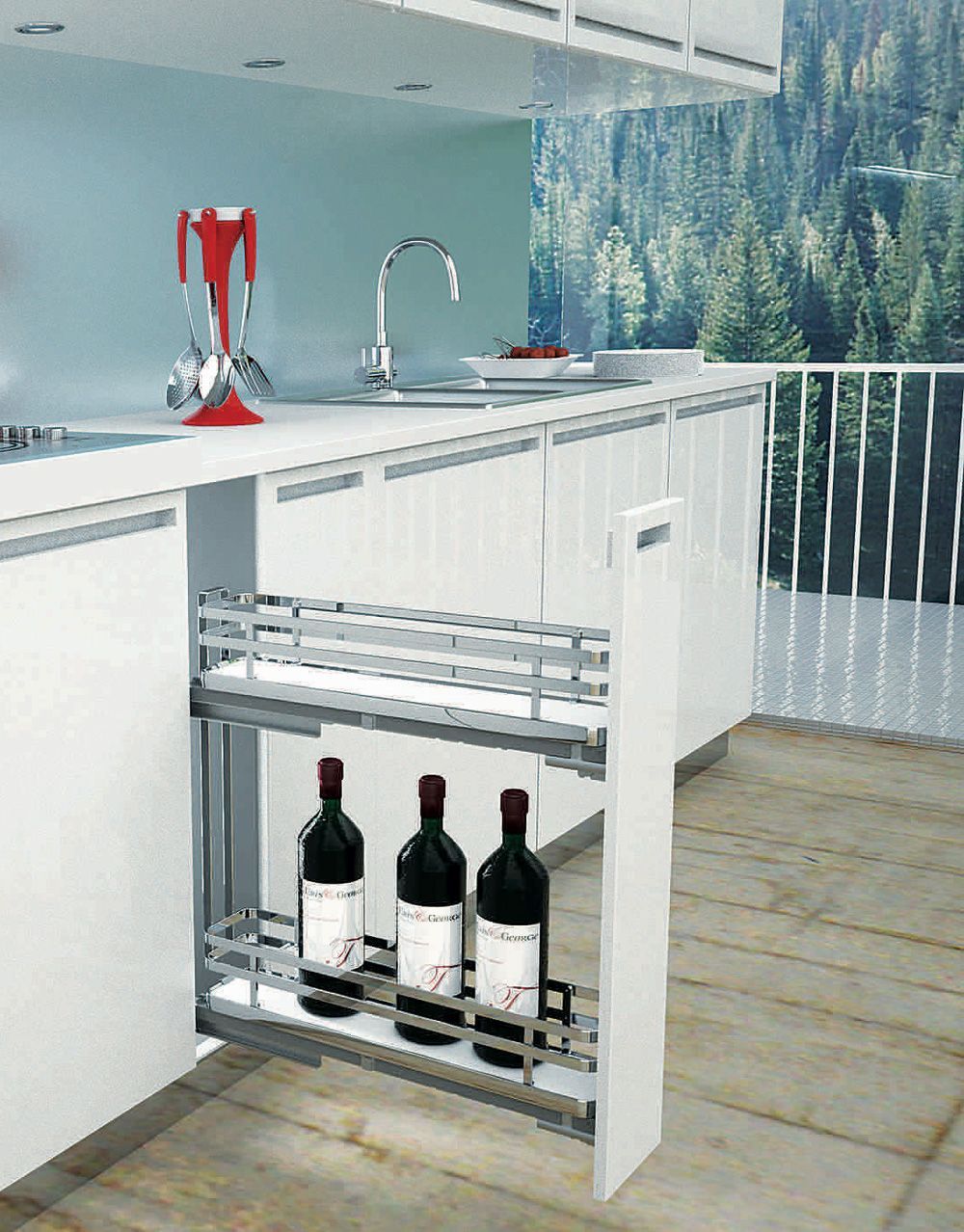 Комплектация: Бутылочница сетчатая (плоский пруток), дно корзин из ламинированного ДСП, направляющие Grass с Soft-Close, 2 крепления фасада (сталь), крепеж.