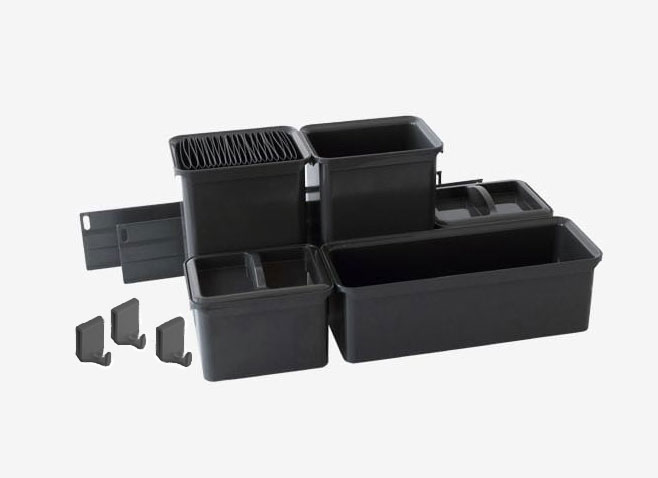 - Набор емкостей №5 Юбокс, Диспенса / Диспенса Джуниор 300 мм, крепление для доски, 2х бокса 1л, 1хбокс 2, 1л., 2хбокса 2л, 2хкрышки, делитель для ножей, цвет АНТРАЦИТ (0052779846) - 1 комплект