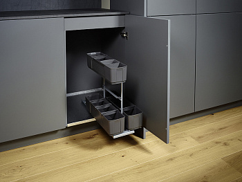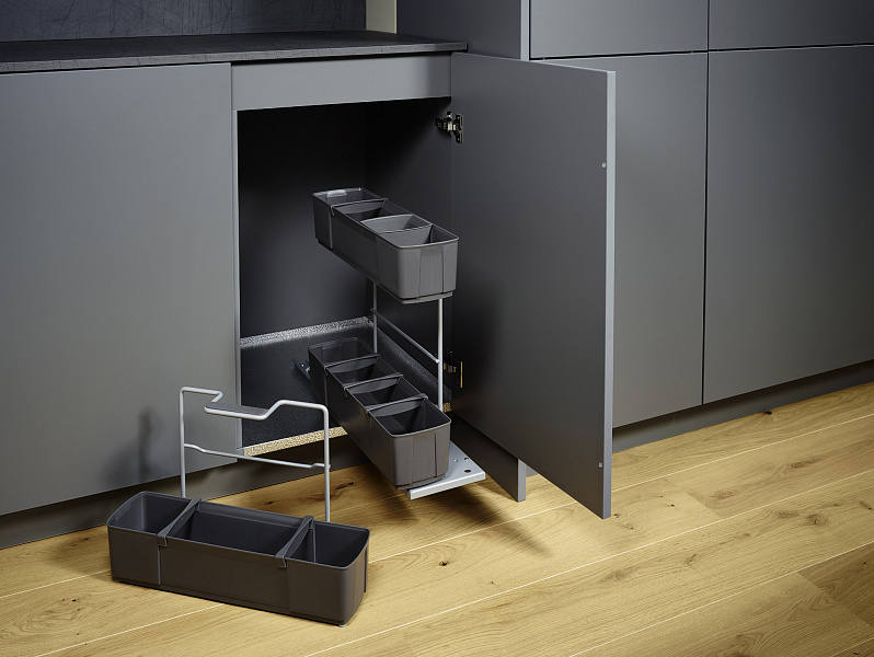 Выдвижной механизм со съемной корзиной и эргономичной ручкой для хранения специальных средств для уборки дома. Вся бытовая химия теперь будет собрана в одном месте! А при необходимости вам будет достаточно просто снять корзину и перенести в нужное место. С обратной стороны каждой емкости находятся силиконовые ножки, благодаря которым вы может ставить ее на любые поверхности и не бояться их повредить. Внутри корзины предусмотрены разделители, фиксирующие положение каждого средства. Нагрузка 12кг.