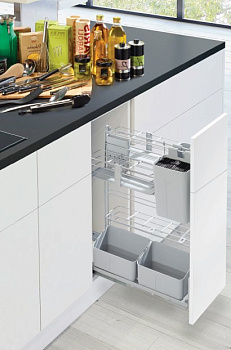 Кухонный агент — ваш модульный кухонный органайзер. Переставляйте навесные корзины местами и подстраивайте хранение под свои нужды! Этот небольшой, но вместительный механизм устанавливается в нижние тумбы с шириной фасада 300 мм и идеально подходит для размещения мелких кухонных помощников, соусов, разделочных досок, ножей, различных емкостей и других вещей, необходимых для приготовления идеального блюда. При желании все содержимое можно переместить вместе с навесными элементами в зону рабочей поверхности, а потом также легко убрать на место. Система крепится к дну шкафа и выдвигается наружу, тем самым обеспечивая быстрый доступ к содержимому одновременно с двух сторон. Сами емкости имеют закрытое дно, легко снимаются, их можно мыть в посудомоечной машине.