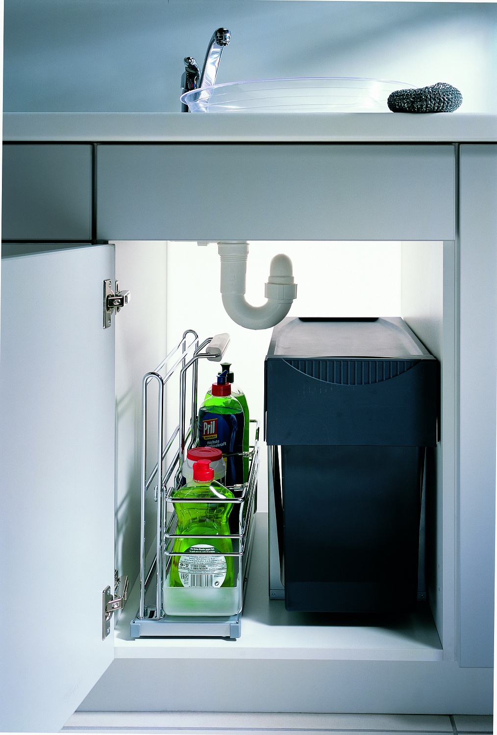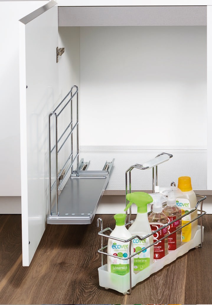 Выдвижной механизм, разработанный специально для хранения бытовой химии и хозяйственных принадлежностей. Доступен в трех различных вариантах: с одной, двумя или тремя емкостями.