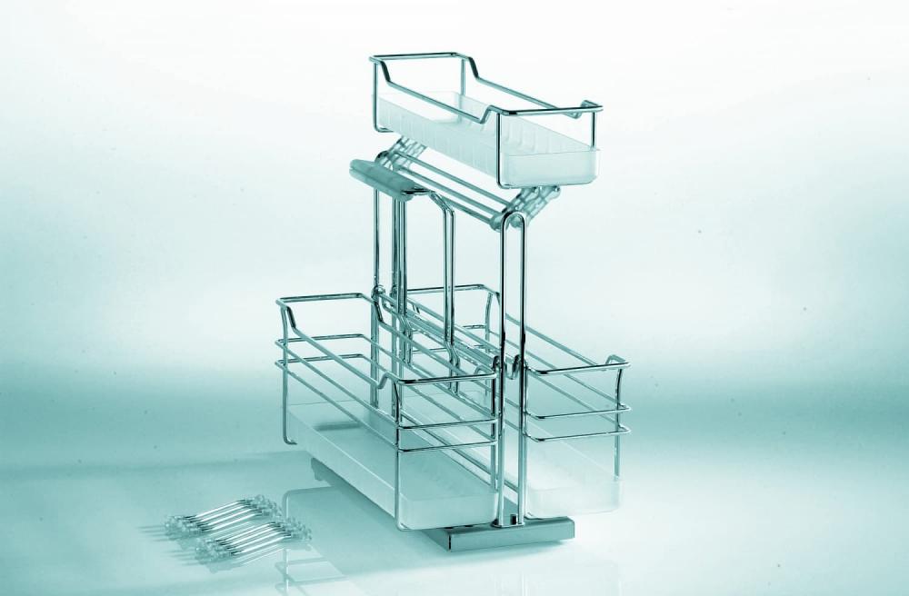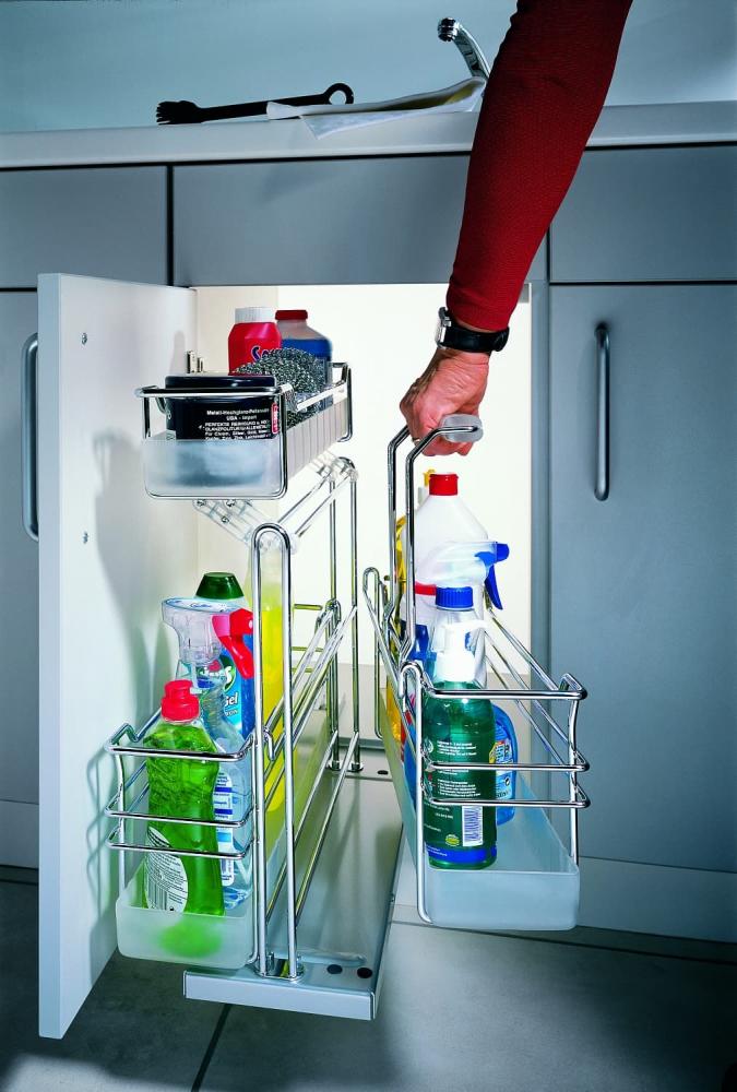 Выдвижной механизм, разработанный специально для хранения бытовой химии и хозяйственных принадлежностей. Доступен в трех различных вариантах: с одной, двумя или тремя емкостями. Главный плюс конструкции — в съемной корзине, которая позволяет взять все чистящие средства с собой в зону уборки, а потом поставить на место. Перекидная верхняя полка обеспечивает лучший доступ и дополнительное место. Надежная и долговечная хромированная рама несет нагрузку 12 кг и может быть установлена в трех положениях – посередине, справа или слева — для более удобного доступа и эффективного использования пространства.