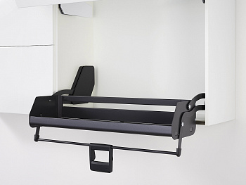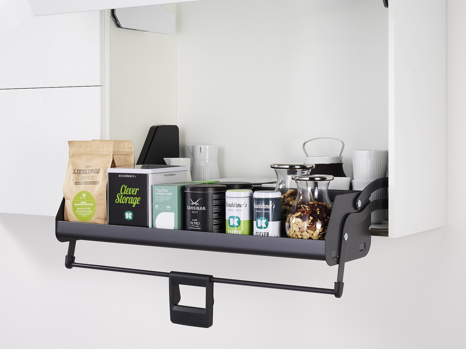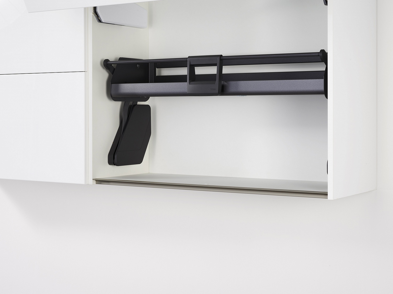 iMove заменяет собой вторую и третью полки в верхних шкафах. Механизм плавно перемещается в зону удобного обзора и надежно фиксируется в этом положении. В сложенном состоянии пространство под ним остается свободным: здесь можно хранить более тяжелые предметы.