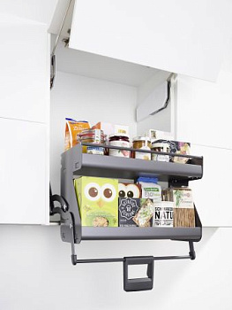 iMove заменяет собой вторую и третью полки в верхних шкафах. Механизм плавно перемещается в зону удобного обзора и надежно фиксируется в этом положении. В сложенном состоянии пространство под ним остается свободным: здесь можно хранить более тяжелые предметы.