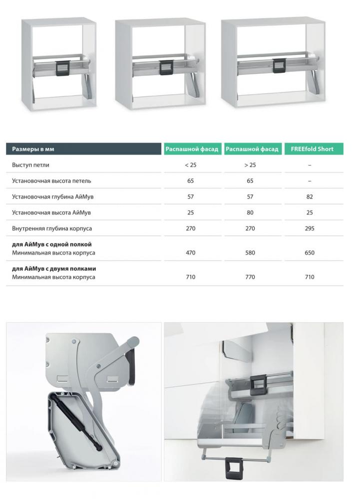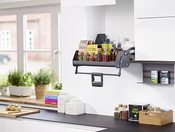 iMove заменяет собой вторую и третью полки в верхних шкафах. Механизм плавно перемещается в зону удобного обзора и надежно фиксируется в этом положении. В сложенном состоянии пространство под ним остается свободным: здесь можно хранить более тяжелые предметы.