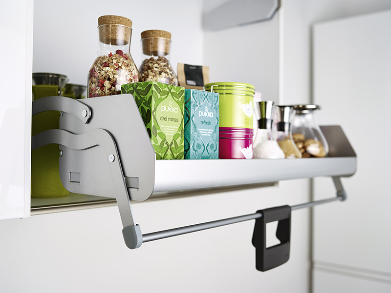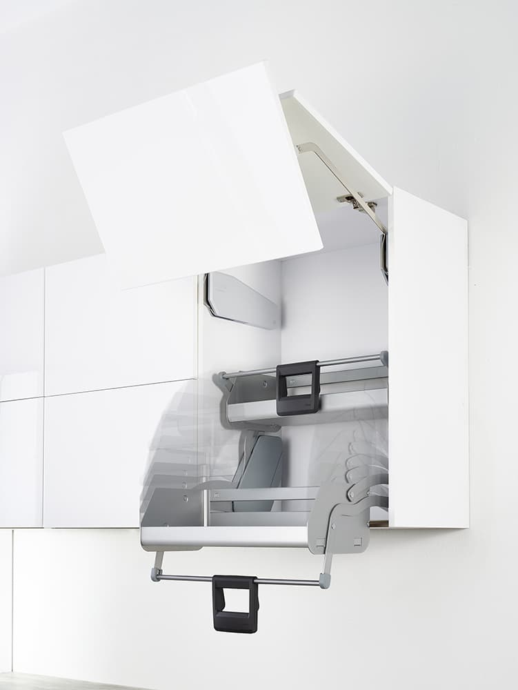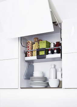 iMove заменяет собой вторую и третью полки в верхних шкафах. Механизм плавно перемещается в зону удобного обзора и надежно фиксируется в этом положении. В сложенном состоянии пространство под ним остается свободным: здесь можно хранить более тяжелые предметы.