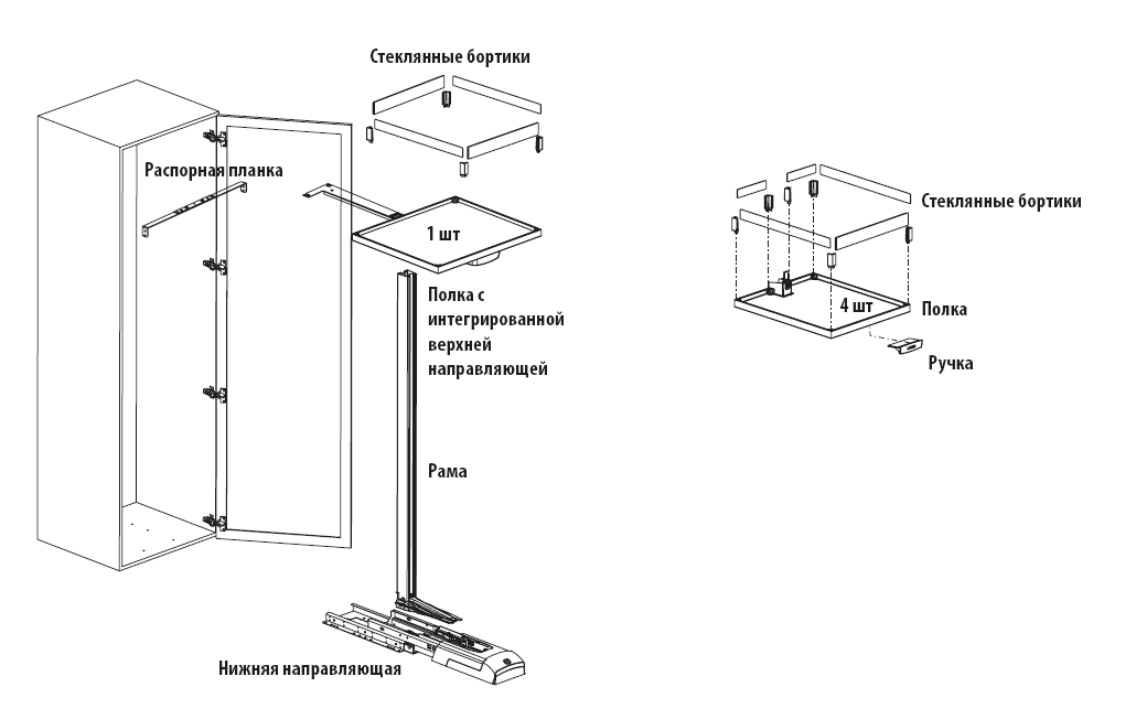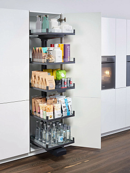 Механизм класса премиум предназначен для высоких и широких шкафов. Оптический эффект парения в воздухе, стабильности и легкости, создается за счет скрытых под верхней и нижней полкой направляющих и внутренней рамы. Система выдвигается из корпуса одним движением очень мягко, даже при ее максимальной нагрузке 130 кг, и обспечивает полный доступ с трех сторон ко всему содержимому. Система Клик Фикс обеспечивает независимую регулировку полок по высоте. Конвой Лавидо - это серьезный и высоко-функциональный инженерный продукт, который легко комбинируется с любыми концепциями шкафов. Стильное дизайнерское решение выражается в гармоничном сочетании элементов разных фактур - прозрачном стекле, благородном дереве и прочном и лаконичном металле.