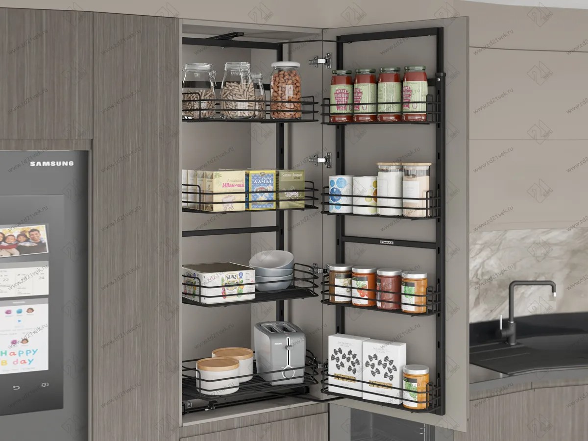 Шкаф-колонна устанавливается в кухонный шкаф и полностью выдвигается вместе с фасадом, создавая максимальный доступ ко всем вещами, которые хранятся внутри.