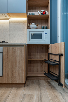 Механизм для разделения пространства в шкафу. Устанавливается на фасад и предоставляет быстрый доступ к самому необходимому. Пространство шкафа делится в пропорции 60/40 для дополнительного обзора и быстрого доступа к продуктам, при этом вес полок и содержимого переносится на корпус и не влияет на функционирование фасада и легкость его открывания.