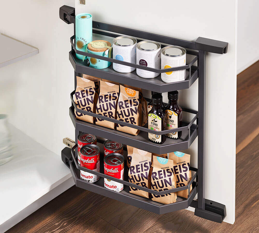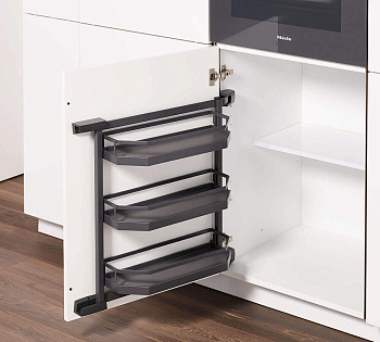 Механизм для разделения пространства в шкафу. Устанавливается на фасад и предоставляет быстрый доступ к самому необходимому. Пространство шкафа делится в пропорции 60/40 для дополнительного обзора и быстрого доступа к продуктам, при этом вес полок и содержимого переносится на корпус и не влияет на функционирование фасада и легкость его открывания.