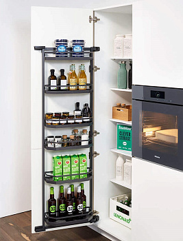 Механизм для разделения пространства в шкафу. Устанавливается на фасад и предоставляет быстрый доступ к самому необходимому. Пространство шкафа делится в пропорции 60/40 для дополнительного обзора и быстрого доступа к продуктам, при этом вес полок и содержимого переносится на корпус и не влияет на функционирование фасада и легкость его открывания. Нагрузка 20 кг.