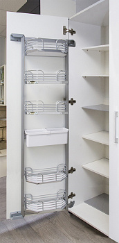 Механизм для разделения пространства в шкафу. Устанавливается на фасад и предоставляет быстрый доступ к самому необходимому. Пространство шкафа делится в пропорции 60/40 для дополнительного обзора и быстрого доступа к продуктам, при этом вес полок и содержимого переносится на корпус и не влияет на функционирование фасада и легкость его открывания.