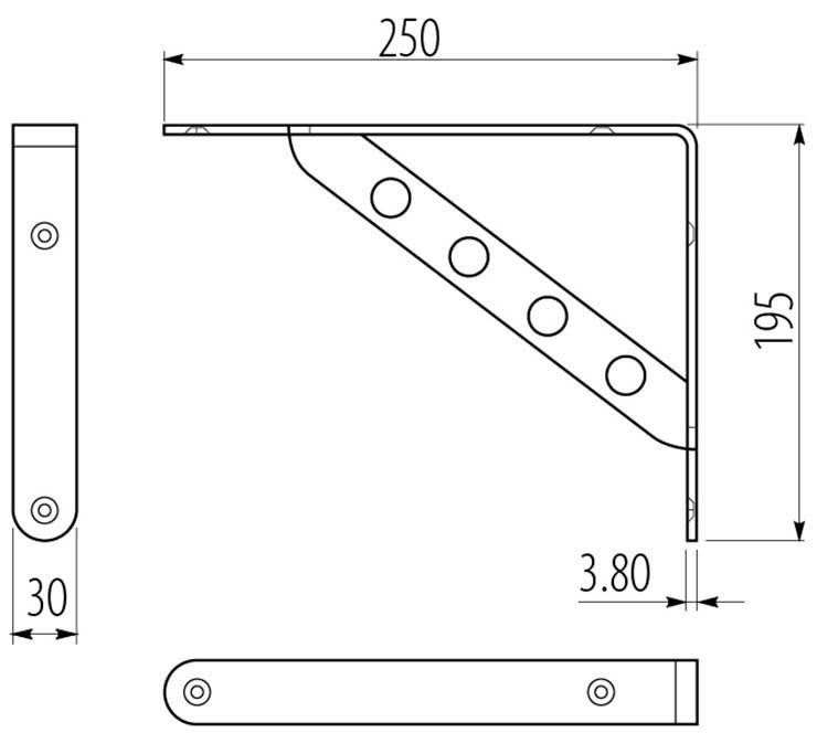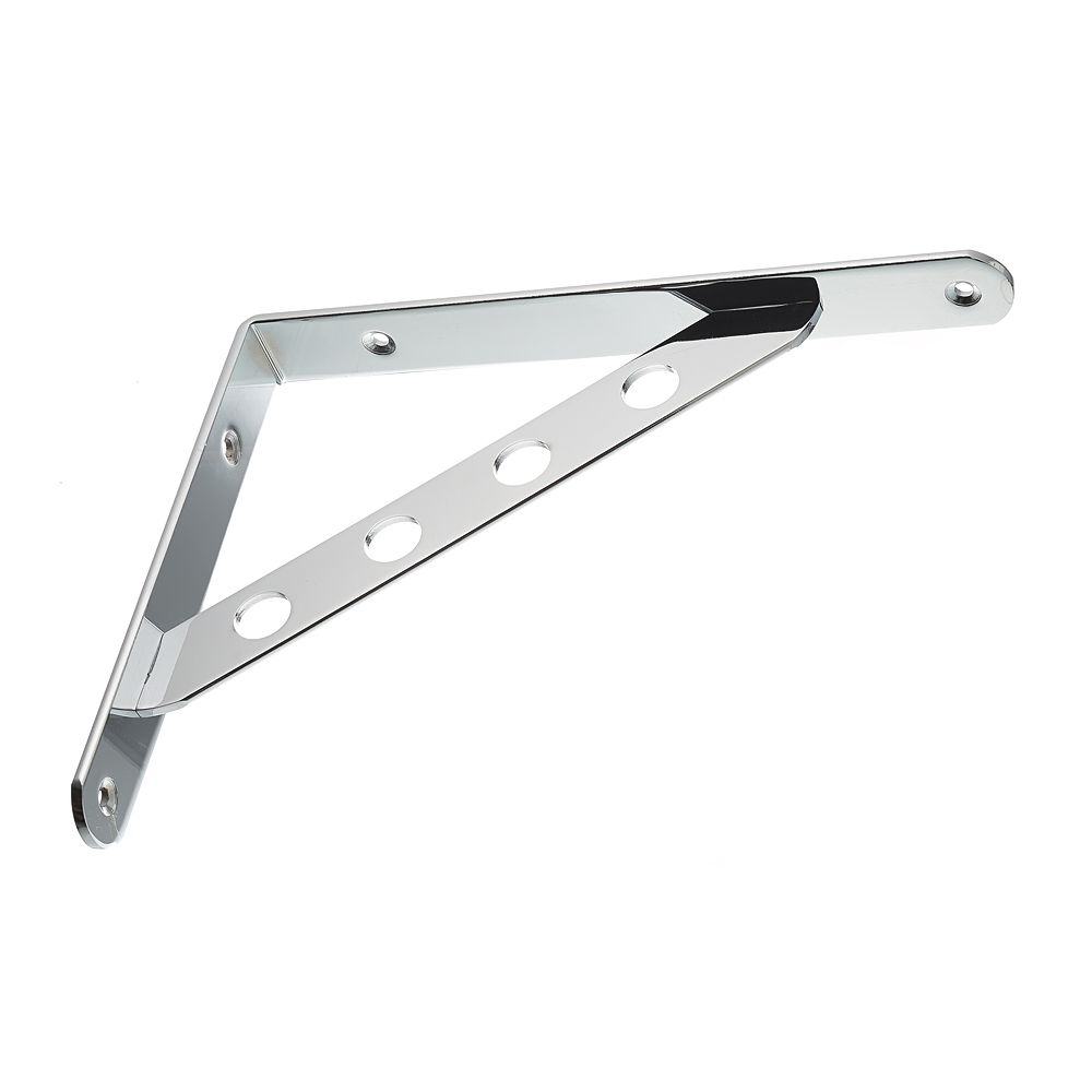 Полкодержатель стальной, c отверстиями, 073024, хром - кронштейн для деревянных полок, который также может быть использован для дополнительной поддержки столешницы. Устанавливается на стену при помощи саморезов. При использовании двух полкодержателей, нагрузка на полку - 30 кг.