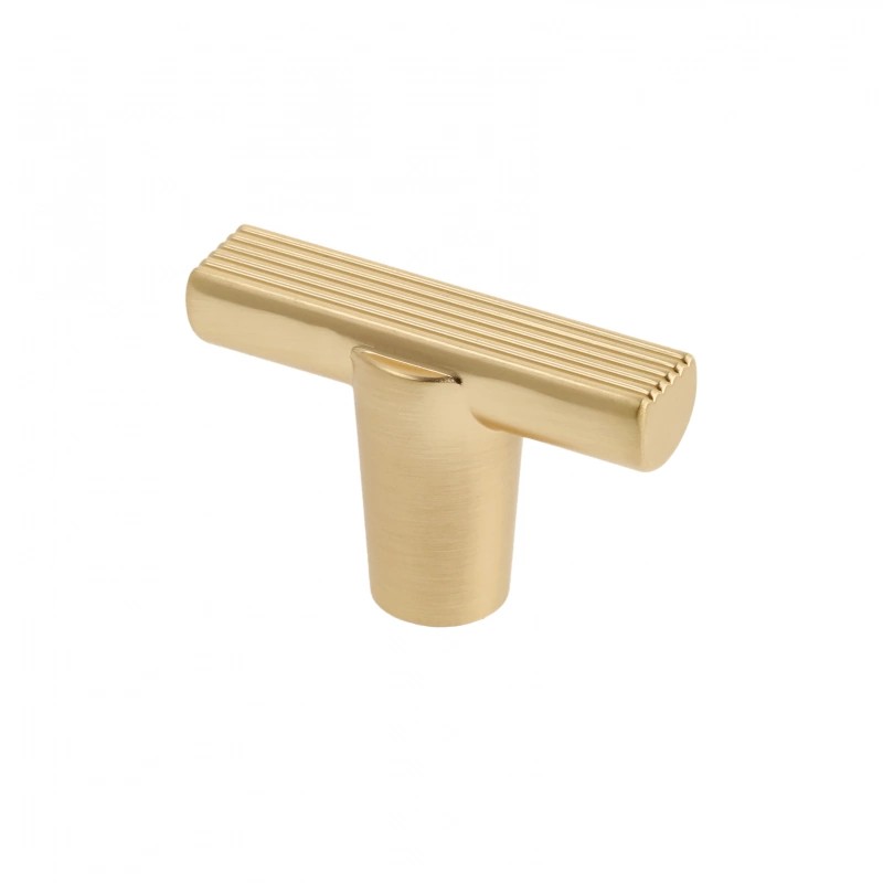 Ручка RAY, брашированное золото - стильный вариант лицевой фурнитуры, красивая ручка-кнопка, отлично вписывающаяся в презентабельный интерьер, выполненный в соответствующем декоре.