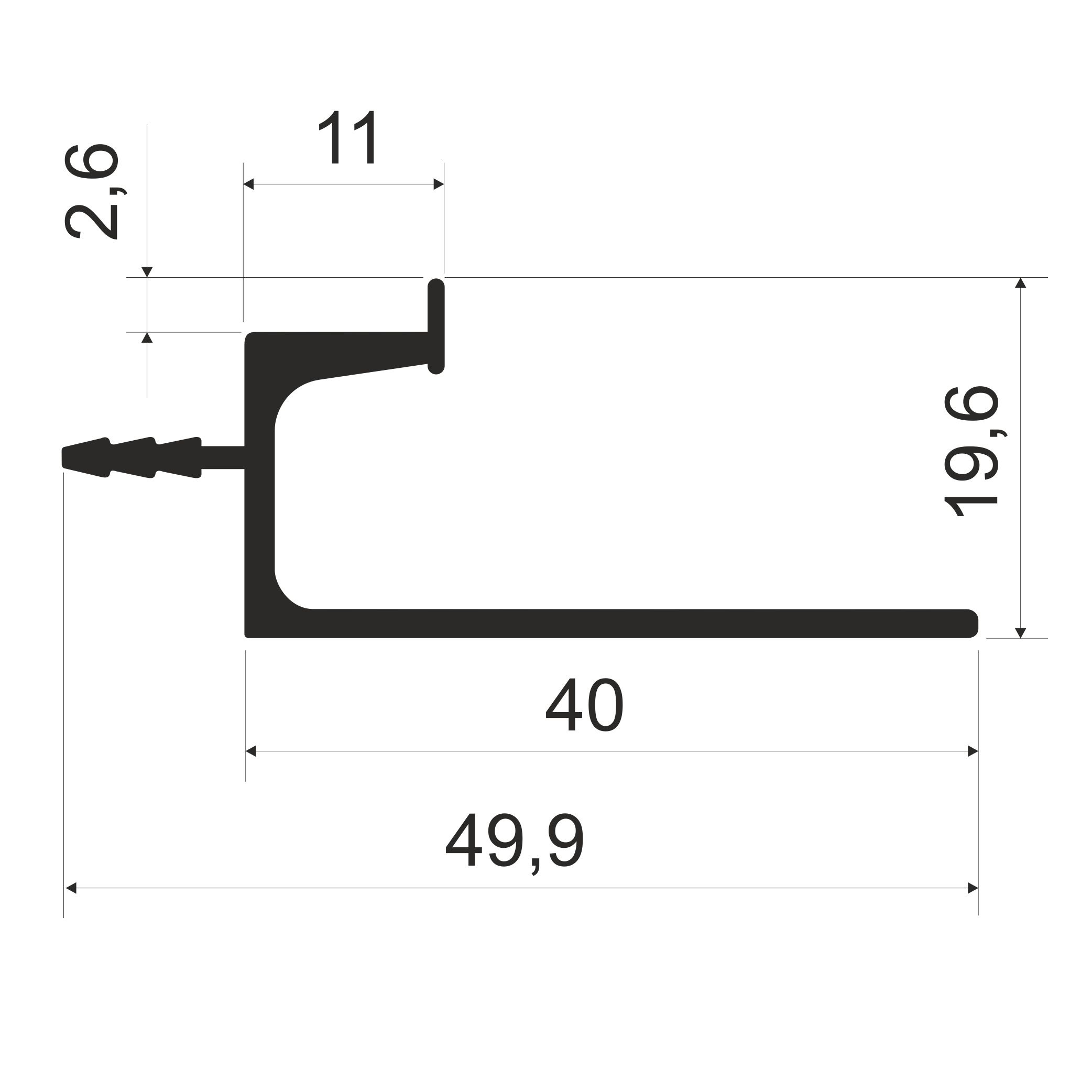 L=5000мм, h= 19,6мм, полная ширина ( врезной частью) = 49,9мм, ширина (без врезной части) = 40мм