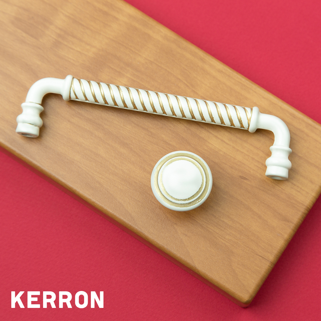 Мебельные ручки KERRON в роскошном сочетании белого цвета с золотой патиной под старину гармонируют с помпезными, торжественными дизайнами кухонь и мебельных гарнитуров. Их утонченность и эклектика также уместна для других интерьерных стилей при умелом использовании. Ручки изготовлены из исключительно качественного материала - высокопрочного сплава цинка и декоративной краски, нанесенной методом порошкового окрашивания с тонировкой дополнительным слоем лака. Это позволяет изделиям сохранять стойкость к влаге, солнечному свету и возможному агрессивному воздействию среды. Ручки KERRON коллекции Classic невероятно эстетичны, долговечны, легки в использовании и уходе. С ними Ваша кухня всегда будет сверкать, блистать и дышать новизной.