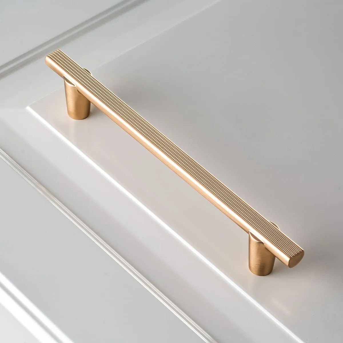 Ручка RAY 128 мм, брашированное золото - практичная лицевая фурнитура, ручка-скоба П-образной формы, подходящая для современных интерьеров с различными дизайнерскими решениями.