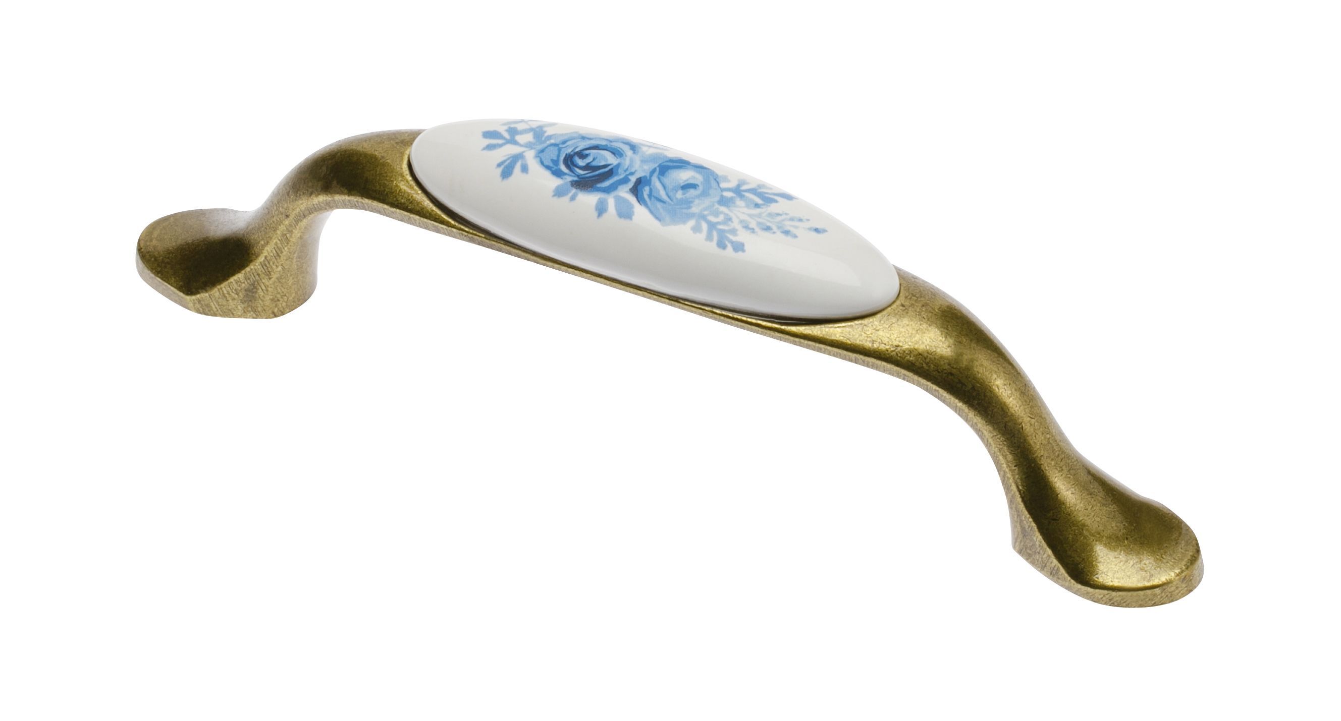 Ручка-скоба, UP-WP0728-PA-04, 96мм, металл/керамика, старое золото/белый с орнаментом (синий)