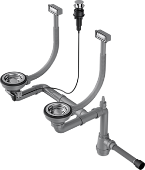 Арматура для двухчашевых моек с прямоугольными переливами, декоративными решетками и клапаном-автомат.