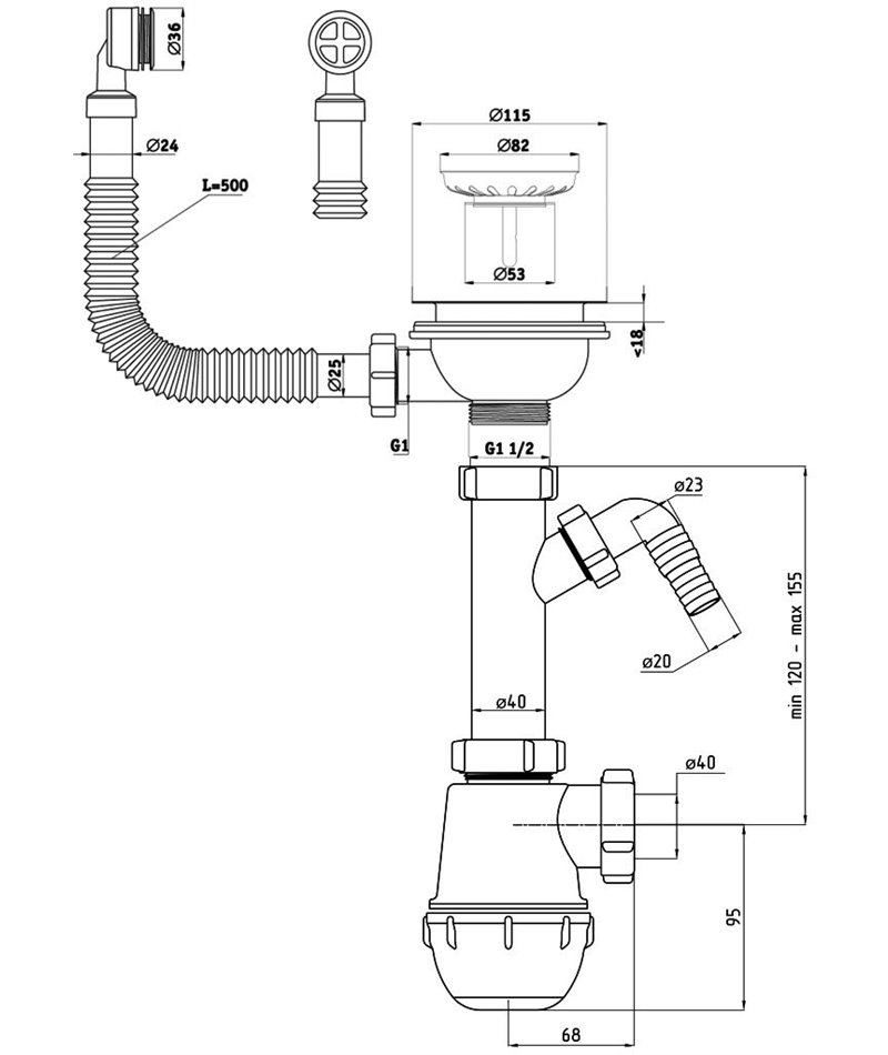 Сифон для кухонных моек с диаметром сливного отверстия 90 мм, бутылочного типа с увеличенным корпусом. С разборным выпуском и нержавеющей решеткой, с жестким прямоугольным переливом для моек из нержавеющей стали. Выпуск перелива оборудован универсальной прокладкой для круглых и прямоугольных моек, нужная сторона прокладки достигается путем переворота. Выход для подключения к канализации 40 мм
